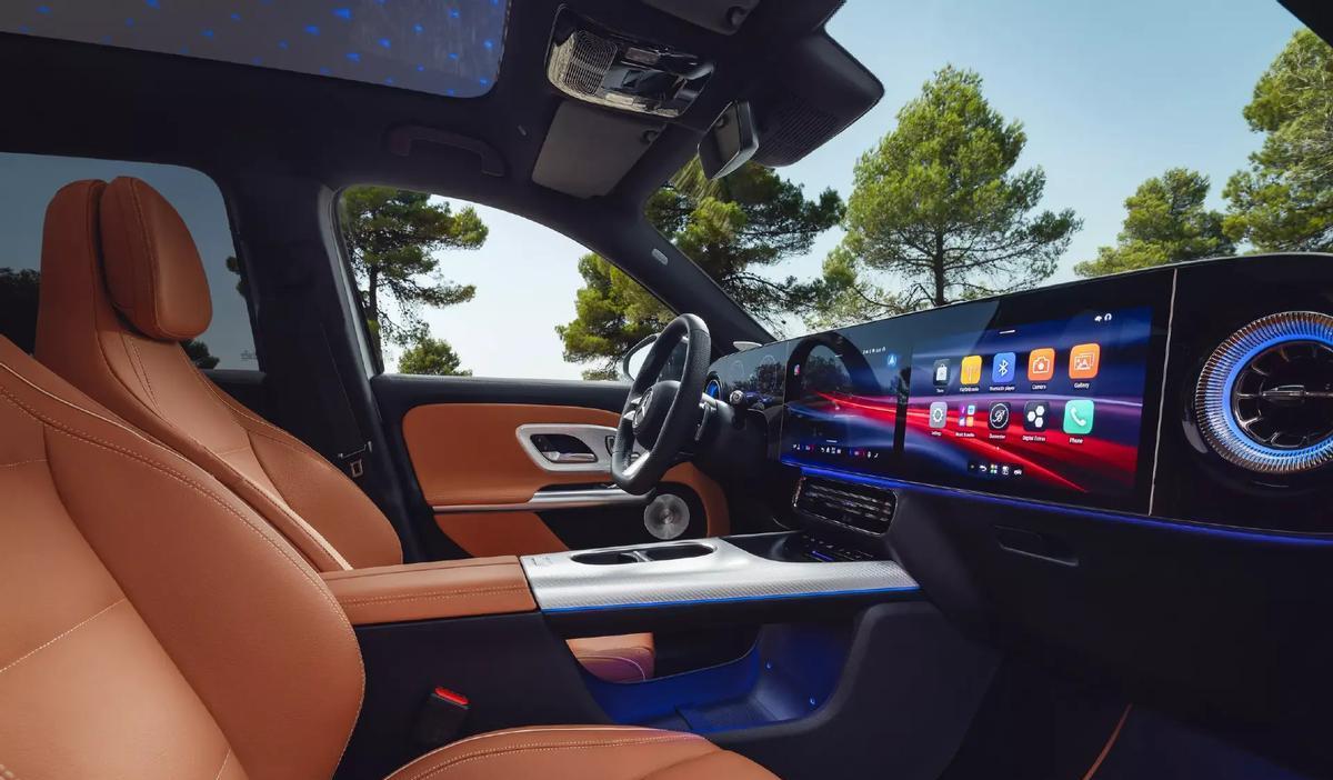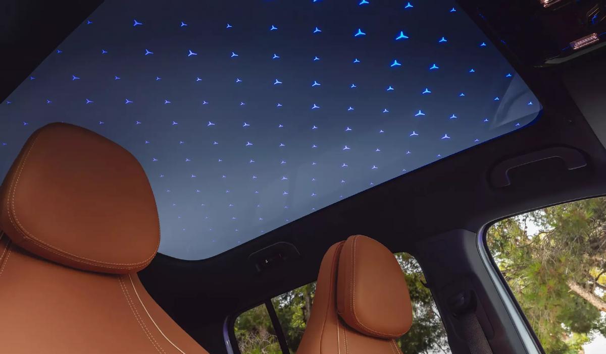 此外,奔驰GLB级的座舱与国产CLA EV之间还有一处差异。它的全景天窗并不是一体式玻璃车顶结构,但却采用与CLA猎装版一样的电致变色天幕,它能够在透明、遮阳以及星空模式之间快速调节,其中,星空模式已经从过去奔驰的满天星光效变为了三叉星车标光效。不得不承认,在强化品牌性方面,奔驰这些传统豪华品牌确实比国产车更好一些。